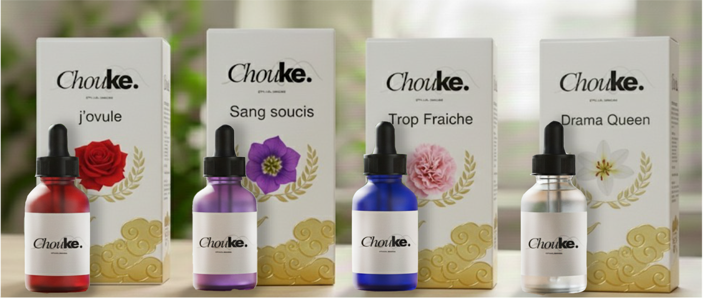 Chaque sérum s’adapte aux phases du cycle; Sang souycis= la phase de menstruation, Trop fraiche= la phase folliculaire, J’ovule= la phase d’ovulation et Drama Queen= la phase lutéal.
